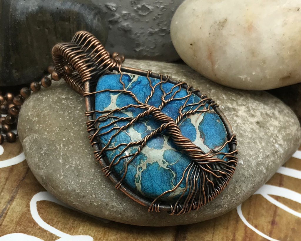 This Tree of Life Pendant Necklace, featuring a beautiful blue Impression Jasper Stone, has been wrapped in oxidized copper wire to bring out all of the details within.