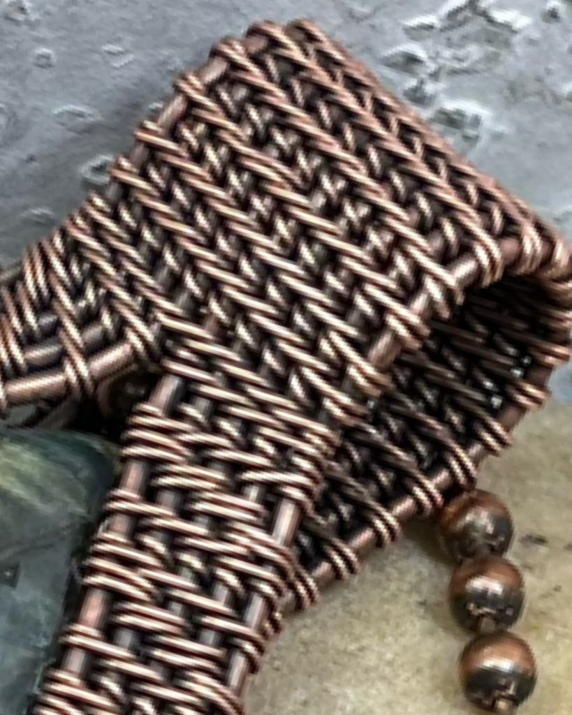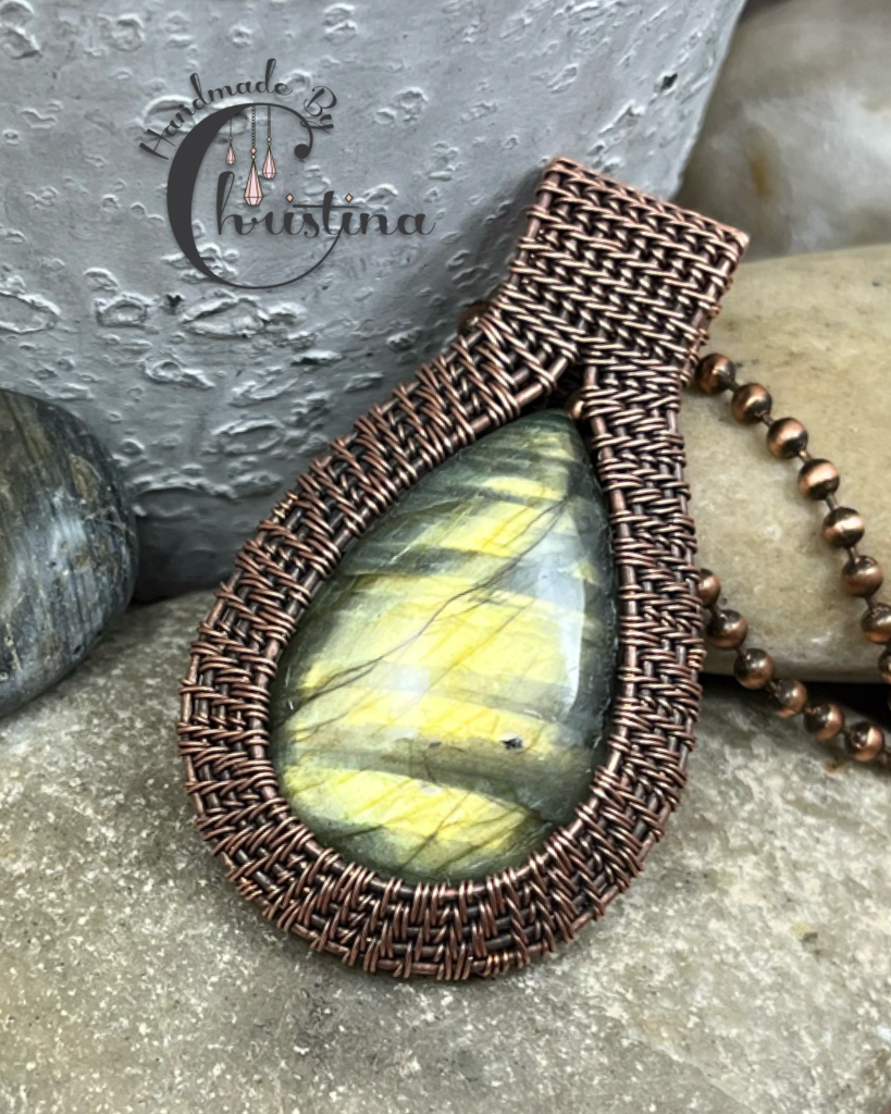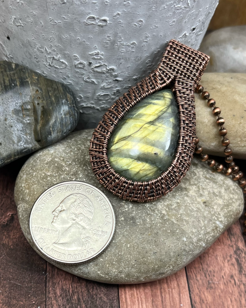 Oxidized Copper Wire Woven Green Flash Labradorite Pendant