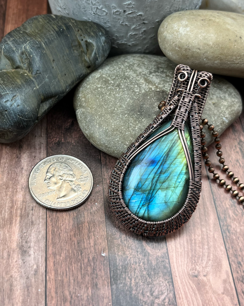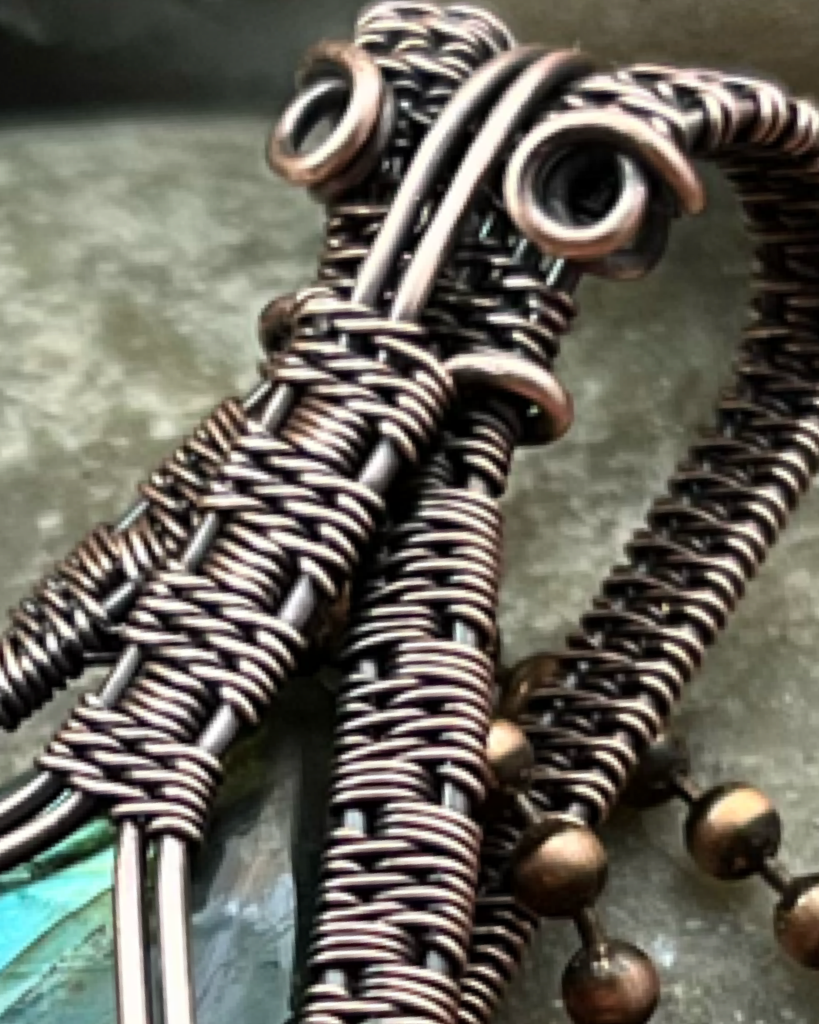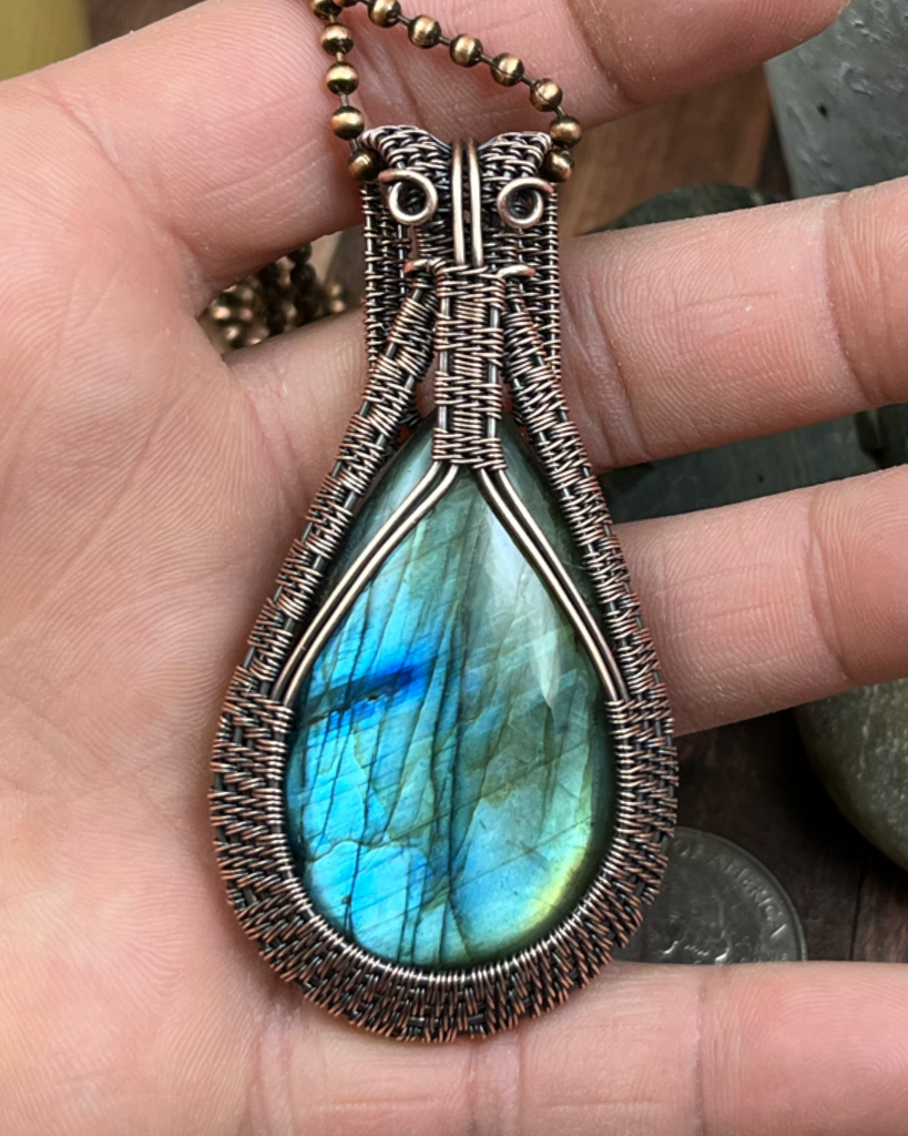 This complex wire woven pendant will be a stunning addition to anyone’s jewelry collection.