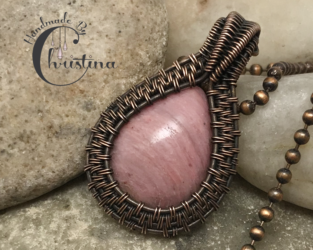 Handcrafted Oxidized Copper Wire Woven Pink Thulite Pendant Necklace – Handmade By Christina